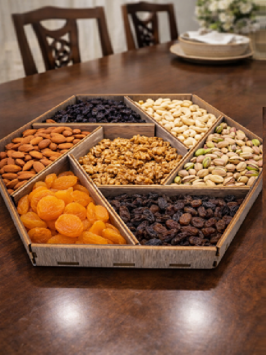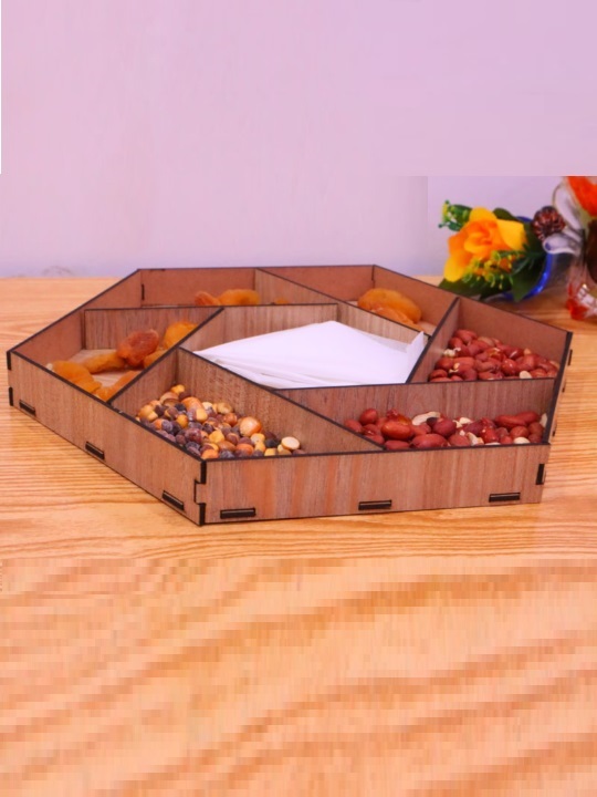 Serve snacks with elegance and creativity using this Hexagon Wooden Dry Fruit Serving Tray, beautifully designed with angular geometric compartments for a modern presentation. The hexagonal shape adds a contemporary touch, while the multiple sections allow you to neatly organize different dry fruits, nuts, seeds, or snacks in one tray.